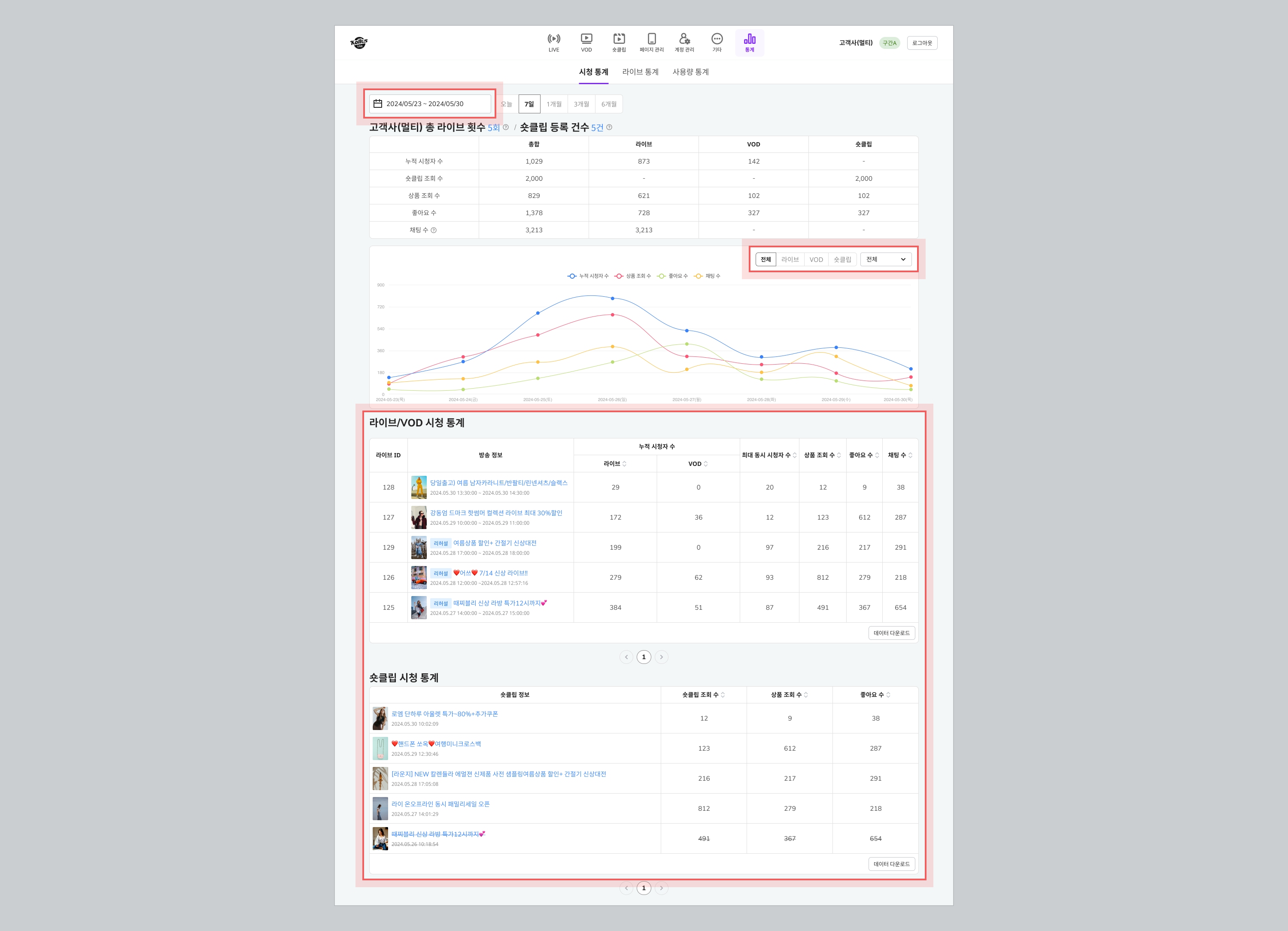 이 페이지에서는 Kollus Live Commerce 관리 시스템에서 시청 통계를 확인하는 방법에 대해 안내합니다.