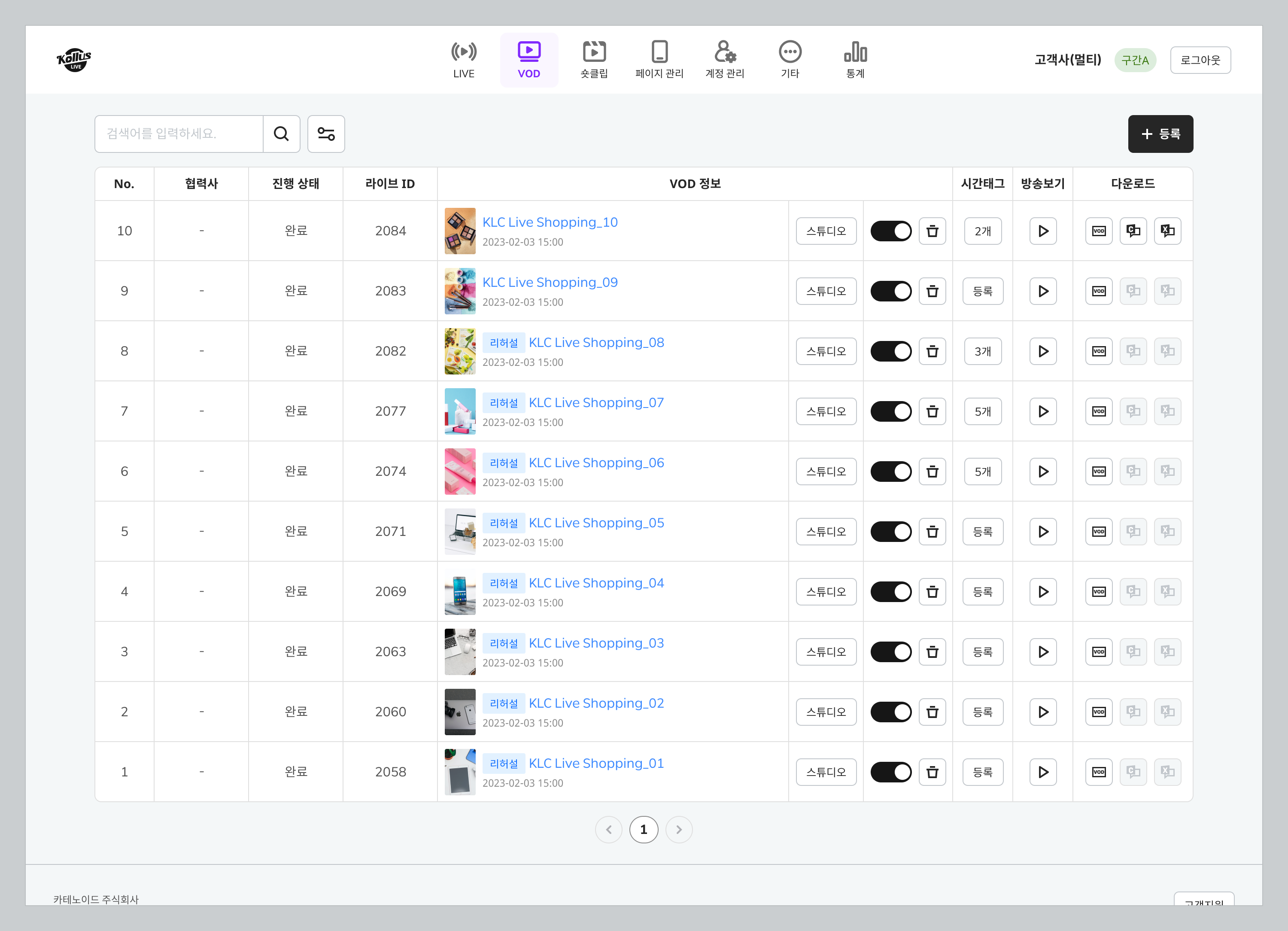 <table><thead><tr><th width="148.5">항목</th><th>설명</th></tr></thead><tbody><tr><td>협력사</td><td>고객사(멀티) 계정에만 노출되는 항목입니다. 고객사(멀티) 계정이 직접 등록한 라이브 방송 또는 VOD 방송일 경우에는 하이픈(-)으로 노출되며 협력사 계정이 등록한 라이브 방송 또는 VOD 방송일 경우에는 협력사명이 노출됩니다.</td></tr><tr><td>진행 상태</td><td><p>해당 VOD 방송의 인코딩 진행 상태를 알 수 있습니다. 진행 상태는 총 2개로 구분됩니다. 변환중 상태에서는 VOD 방송 인코딩 진행률이 백분율(%)로 표시됩니다.</p><ul><li>VOD 방송 인코딩 중: <strong>변환중</strong> 표기</li><li>VOD 방송 인코딩 완료: <strong>완료</strong> 표기</li></ul></td></tr><tr><td>라이브 ID</td><td>라이브 방송 송출 종료 이후 변환된 VOD 방송인 경우, 해당 라이브 방송의 라이브 ID가 표시됩니다. 라이브 ID를 이용하여 <strong>LIVE > 라이브 관리</strong> 페이지에서 라이브 방송을 검색하고 조회할 수 있습니다. VOD 메뉴에서 VOD 방송을 추가로 등록할 경우에도 라이브 ID가 자동으로 생성됩니다.</td></tr><tr><td>VOD 정보</td><td><p>라이브 방송 송출 종료 이후 변환된 VOD 방송인 경우, 해당 라이브 방송의 대표 이미지와 라이브 타이틀, 방송 시작 일시가 노출됩니다. VOD 메뉴에서 직접 등록한 VOD 방송인 경우, 등록한 대표 이미지와 VOD 타이틀, 등록 일시가 노출됩니다.</p><p><strong>스튜디오</strong> 버튼을 클릭하면 해당 VOD 방송의 판매 상품, 팝업, 쿠폰을 확인하고 관리할 수 있는 라이브 스튜디오 페이지가 브라우저에서 새 창으로 열립니다.</p><p>또한 활성화 버튼을 통해 해당 VOD 방송 노출 상태를 선택할 수 있습니다. 해당 VOD 방송을 방송 전시 페이지에 노출하려면 활성화 상태로, 노출하지 않으려면 비활성화 상태로 설정합니다. <strong>삭제(🗑️)</strong> 아이콘을 클릭하면 해당 VOD 방송 정보가 삭제됩니다. 단, VOD 방송 정보를 삭제하면 복구는 불가능합니다.</p></td></tr><tr><td>시간 태그</td><td>VOD 방송 화면에서 시간 태그로 등록한 주요 장면으로 바로 이동하여 재생할 수 있는 기능입니다. 해당 VOD 방송에 등록되어 있는 시간 태그의 전체 개수를 확인할 수 있으며, 등록되어 있는 시간 태그가 없는 경우에는 <strong>등록</strong>으로 표시됩니다. 해당 기능에 대한 자세한 내용은 <a href="vod/timetag">시간 태그 등록</a>에서 확인하실 수 있습니다.</td></tr><tr><td>방송보기</td><td><strong>재생(▷)</strong> 아이콘을 클릭하면 해당 VOD 방송 화면이 브라우저에서 새 창으로 열립니다.</td></tr><tr><td>다운로드</td><td><strong>VOD</strong> 버튼을 클릭하면 해당 VOD 방송이 mp4 파일로 다운로드되며, <strong>채팅</strong> 버튼을 클릭하면 해당 라이브 방송 중 전송된 전체 채팅 내역들이 csv, xlsx 파일로 다운로드됩니다. 단, 진행 상태가 종료로 변경되어야만 해당 영역의 버튼들이 활성화 상태로 변경됩니다.</td></tr></tbody></table>