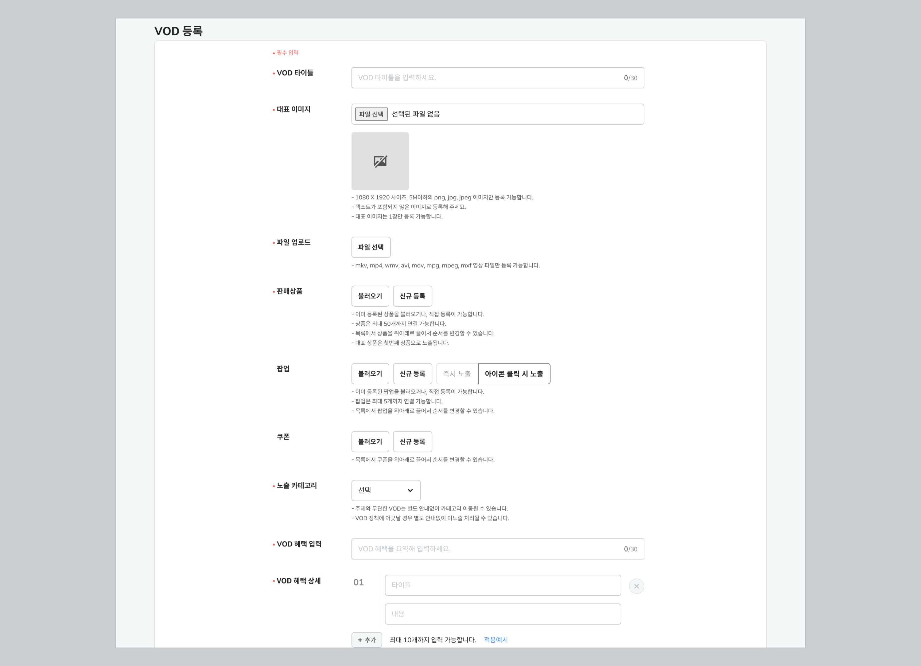 <table><thead><tr><th width="190.5">항목</th><th>설명</th></tr></thead><tbody><tr><td><mark style="color:red;">*</mark> VOD 타이틀</td><td>VOD 타이틀을 입력합니다. VOD 타이틀은 공백 포함 최대 30자까지 입력할 수 있습니다.</td></tr><tr><td><mark style="color:red;">*</mark> 대표 이미지</td><td>VOD 방송 화면의 대표 이미지를 등록합니다. 대표 이미지는 한 장만 등록 가능하며 5 MB 이하의 1080 × 1920 px 사이즈로 제작된 png, jpg, jpeg 이미지 파일만 등록할 수 있습니다. 단, 텍스트가 포함되지 않은 이미지로 등록하는 것을 권장합니다.</td></tr><tr><td><mark style="color:red;">*</mark> 파일 업로드</td><td>등록할 VOD 방송 파일을 업로드합니다. mkv, mp4, wmv, avi, mov, mpg, mpeg, mxf 포맷의 동영상 파일만 등록할 수 있습니다.</td></tr><tr><td><mark style="color:red;">*</mark> 판매상품</td><td>VOD 방송에서 판매할 상품들을 연결합니다. Kollus Live Commerce 관리 시스템에 연동되어 있거나 등록되어 있는 상품을 불러올 수 있으며, 상품 정보를 바로 등록할 수도 있습니다. 상품은 최대 50개까지 연결 가능합니다. 또한 상품 정보를 위아래로 끌어서 노출 순서를 변경할 수 있으며 최상단에 위치한 상품이 대표 상품으로 노출됩니다.</td></tr><tr><td>팝업</td><td>VOD 방송 화면에 노출할 팝업을 연결합니다. Kollus Live Commerce 관리 시스템에 등록되어 있는 팝업을 불러오거나, 팝업 정보를 바로 등록할 수 있습니다. 팝업은 최대 5개까지 연결할 수 있으며, 팝업을 등록한 다음 목록에서 팝업 정보를 위아래로 끌어서 순서를 변경할 수도 있습니다. 또한 등록한 팝업을 라이브 방송 화면 진입 즉시 노출할지, 라이브 방송 화면에서 팝업 아이콘 클릭 시 노출할지 선택 가능합니다.</td></tr><tr><td>쿠폰</td><td>VOD 방송 화면에 노출할 쿠폰을 연결합니다. Kollus Live Commerce 관리 시스템에 등록되어 있는 쿠폰을 불러올 수 있으며 VOD 목록에서 쿠폰 정보를 위아래로 끌어서 순서를 변경할 수도 있습니다.</td></tr><tr><td><mark style="color:red;">*</mark> 노출 카테고리</td><td>VOD 방송을 노출할 카테고리를 설정합니다. 카테고리는 <strong>LIVE > 카테고리 관리</strong> 메뉴에서 등록 및 수정이 가능합니다. 만약 해당 방송이 설정한 카테고리와 무관할 경우에는 별도 안내 없이 노출 카테고리가 변경될 수 있으며, 라이브 정책에 어긋날 경우에는 별도 안내 없이 미노출 처리될 수 있습니다.</td></tr><tr><td><mark style="color:red;">*</mark> VOD 혜택 입력</td><td>VOD 방송 혜택을 요약하여 입력합니다. 공백 포함 최대 30자까지 입력할 수 있습니다.</td></tr><tr><td><mark style="color:red;">*</mark> VOD 혜택 상세</td><td>VOD 방송 혜택에 대한 타이틀과 내용을 입력합니다. 타이틀은 공백 포함 최대 30자까지 입력할 수 있으며, 내용은 공백 포함 최대 200자까지 입력할 수 있습니다. <strong>+ 추가</strong> 버튼을 클릭하면 입력 필드를 추가할 수 있으며, 최대 10개까지 등록 가능합니다. <strong>적용예시</strong> 텍스트 버튼을 클릭하면 적용 예시 이미지를 확인할 수 있습니다.</td></tr><tr><td>자주 묻는 질문</td><td>해당 VOD 방송과 관련되어 고객들이 자주 묻는 질문에 대한 내용과 답변을 입력할 수 있습니다. 질문은 공백 포함 최대 50자까지 입력할 수 있으며, 답변은 공백 포함 최대 200자까지 입력할 수 있습니다. <strong>+ 추가</strong> 버튼을 클릭하여 입력 필드를 추가할 수 있으며, 최대 10개까지 등록 가능합니다. <strong>적용예시</strong> 텍스트 버튼을 클릭하면 적용 예시 이미지를 확인할 수 있습니다.</td></tr><tr><td>VOD 이미지</td><td>방송 전시 페이지의 지난 LIVE 모아보기 영역에 노출할 VOD 이미지를 등록합니다. 5 MB 이하의 288×288px 사이즈로 제작된 png, jpg, jpeg 이미지 파일만 등록할 수 있습니다. 단, 텍스트가 포함되지 않은 이미지로 등록하는 것을 권장합니다. 이미지를 등록하지 않을 경우, 지난 LIVE 모아보기 영역에 대표 이미지가 VOD 이미지로 노출됩니다. (단, 스킨 C를 사용하실 경우에는 해당 항목이 노출되지 않습니다.)</td></tr><tr><td><mark style="color:red;">*</mark> VOD 소개 이미지</td><td>VOD 방송을 소개할 이미지를 등록합니다. 이미지는 최대 세 장까지 등록 가능하며 5 MB 이하 의 800×1200px 사이즈로 제작된 png, jpg, jpeg 이미지 파일만 등록할 수 있습니다. 단, 텍스트가 포함되지 않은 이미지로 등록하는 것을 권장합니다. <strong>적용예시</strong> 텍스트 버튼을 클릭하면 적용 예시 이미지를 확인할 수 있습니다.</td></tr></tbody></table>