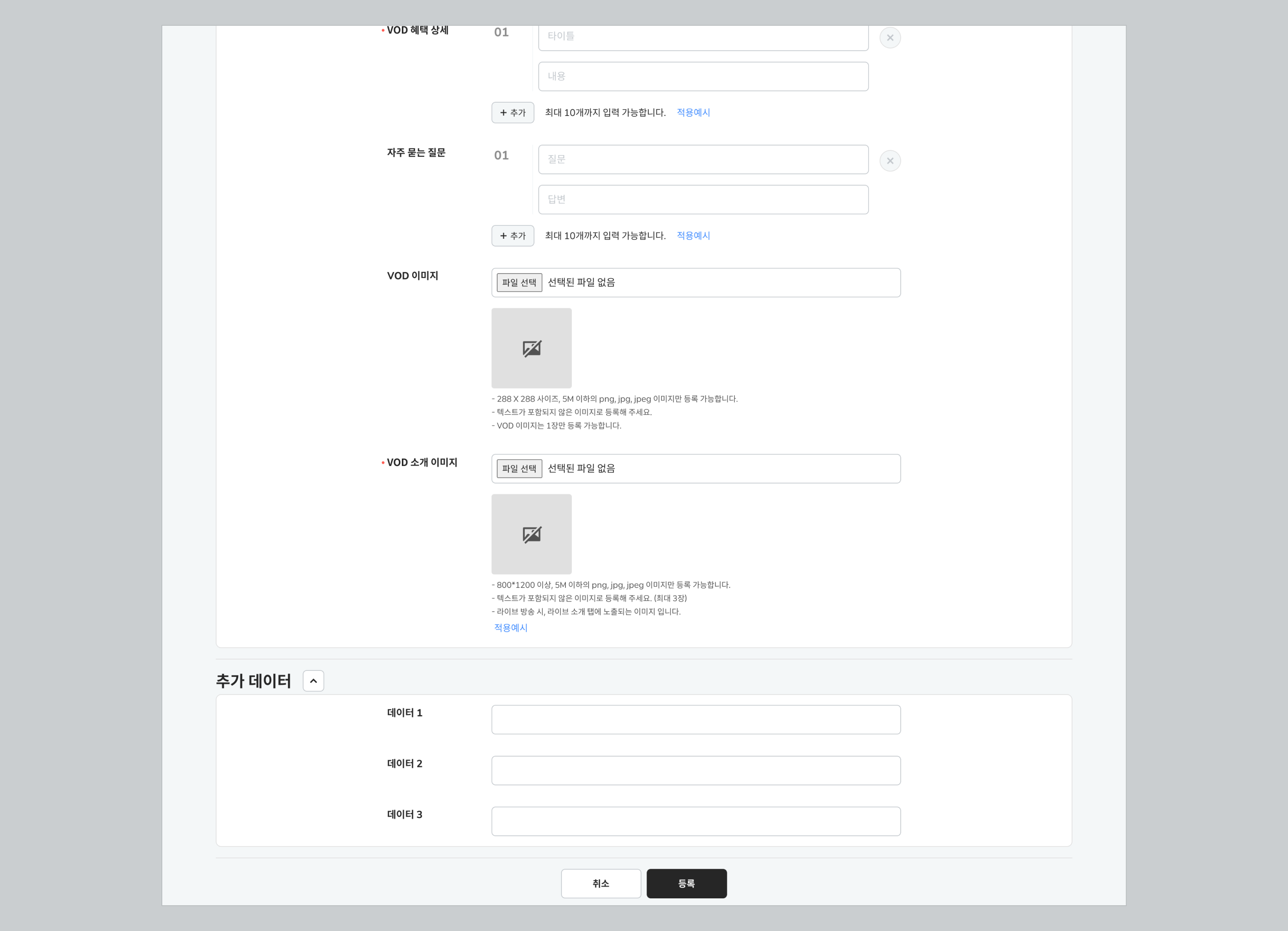 VOD 페이지에서 VOD 방송을 추가로 등록할 수 있습니다. **+ 등록** 버튼을 클릭하면 VOD 등록 페이지가 조회됩니다. 필수 입력 항목들을 모두 입력한 후, 하단의 **등록** 버튼을 클릭하면 VOD 방송이 등록됩니다. VOD 등록 페이지에서 입력해야 할 항목은 다음과 같습니다.