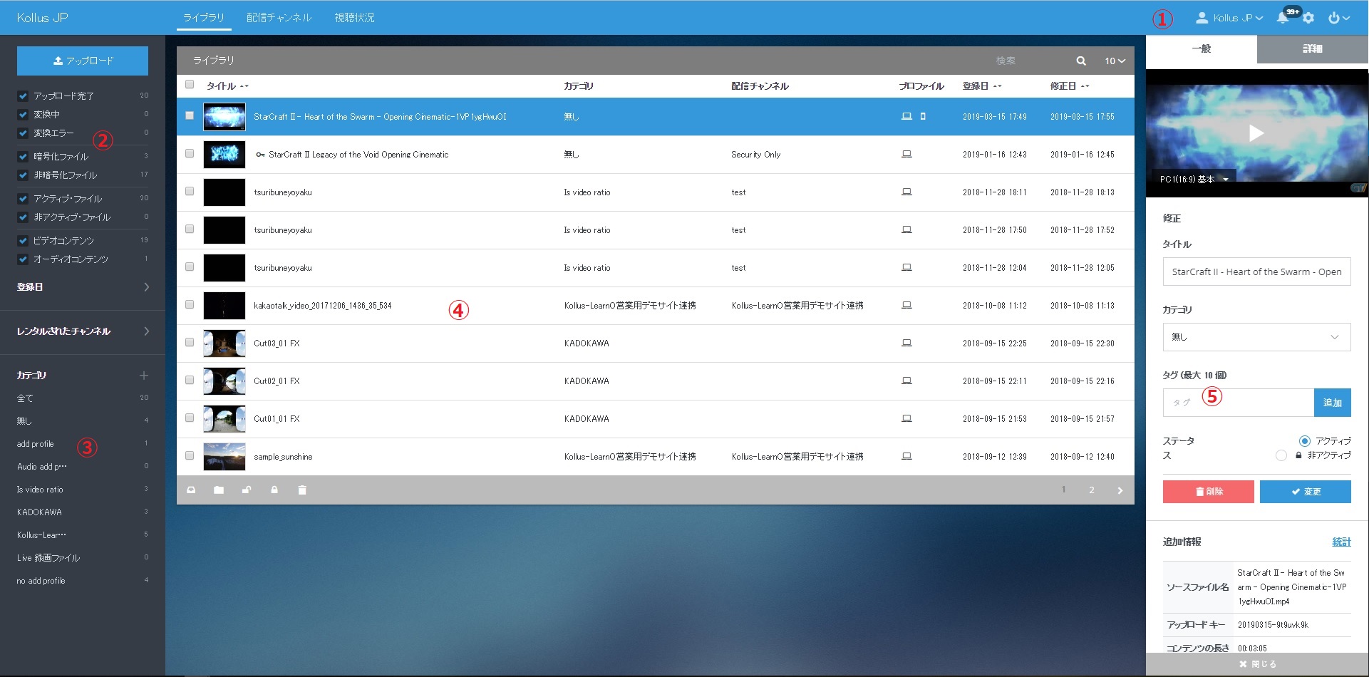> 2\. ライブラリの状況が表示されます。ファイルアップロード及びトランスコーディング後の結果が更新されます。全体のトランスコーディングの状況、暗号化・非暗号化、ビデオ・オーディオコンテンツで区別し、チェックボックスから表示有無を変更することができます。