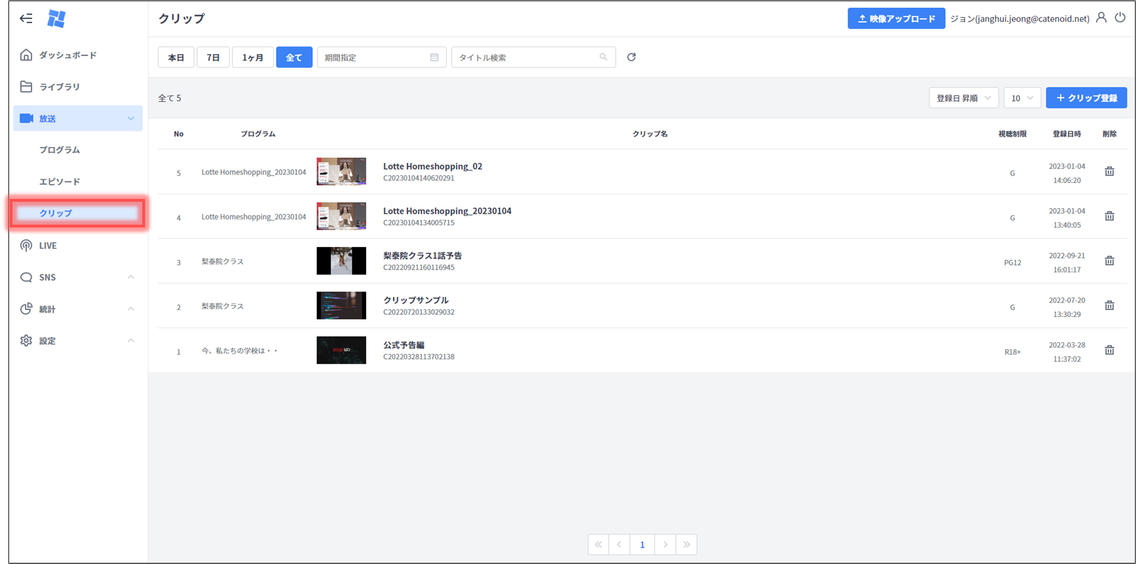 <figure><img src="https://1645409758-files.gitbook.io/~/files/v0/b/gitbook-x-prod.appspot.com/o/spaces%2FVZPxiTCmPCPLyarFc1PP%2Fuploads%2FGscU8uybMMpGx4tMxJqy%2Fimage.png?alt=media&#x26;token=8637e641-ddd7-403c-ae99-06f71f932328" alt=""><figcaption><p>クリップリスト画面</p></figcaption></figure>