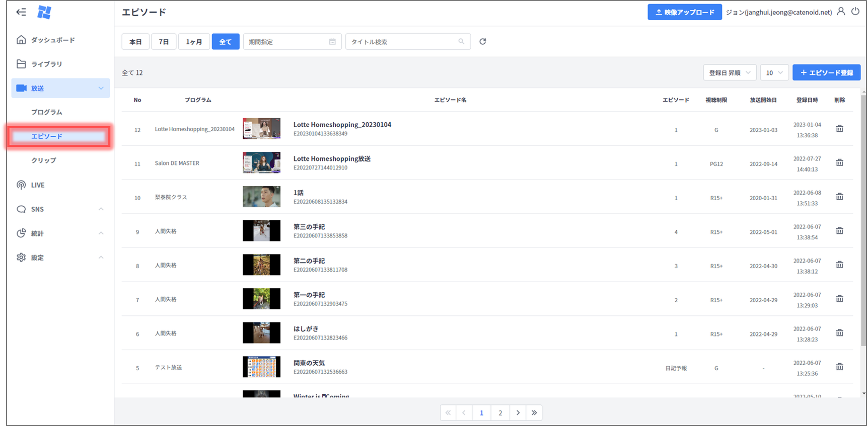 1回あたりの放送分を意味します。メディアコンテンツ別の放送回数が増える場合、プログラムを複数のエピソードで分けて放送することができます。Loomexのエピソードはエピソード情報、視聴年齢制限、エピソード名などのメタデータを登録して管理することができます。