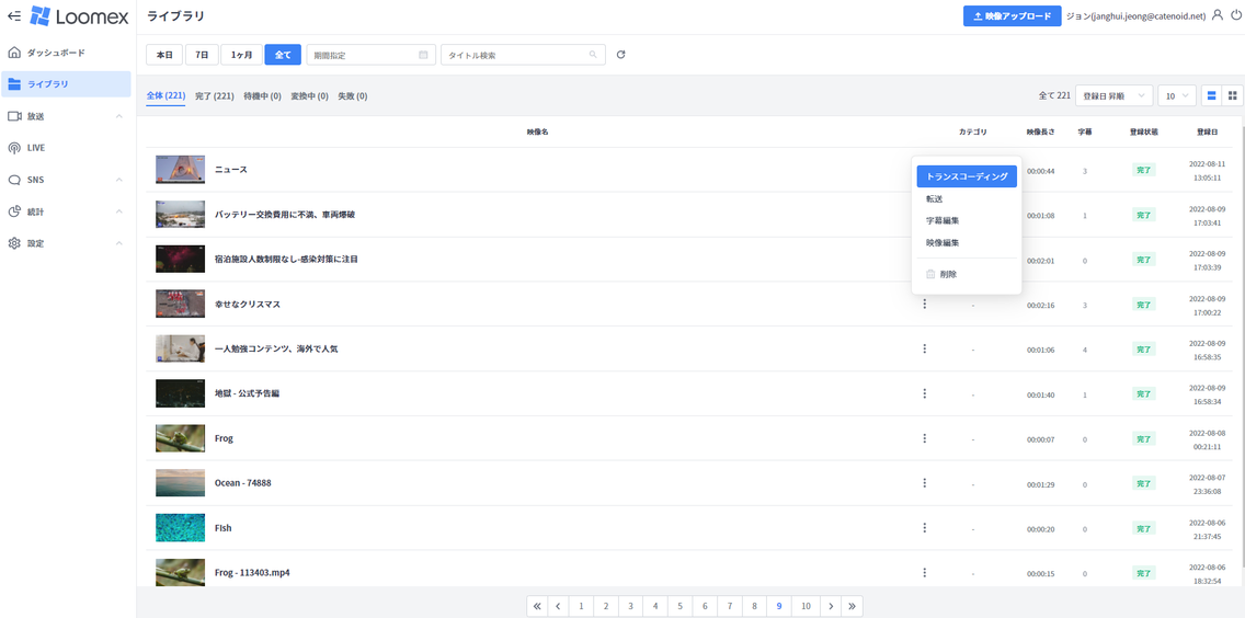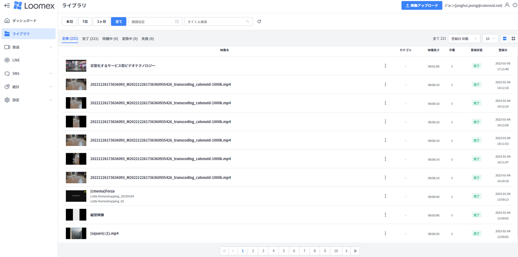 | 登録状態     | 映像アップロード画面またはライブラリ画面の登録状態からアップロードの進行状況を確認することができます。状況によって待機・変換中・完了・失敗に表示されます。                                                                                                                                                                                                                                                                                                                                                     |
