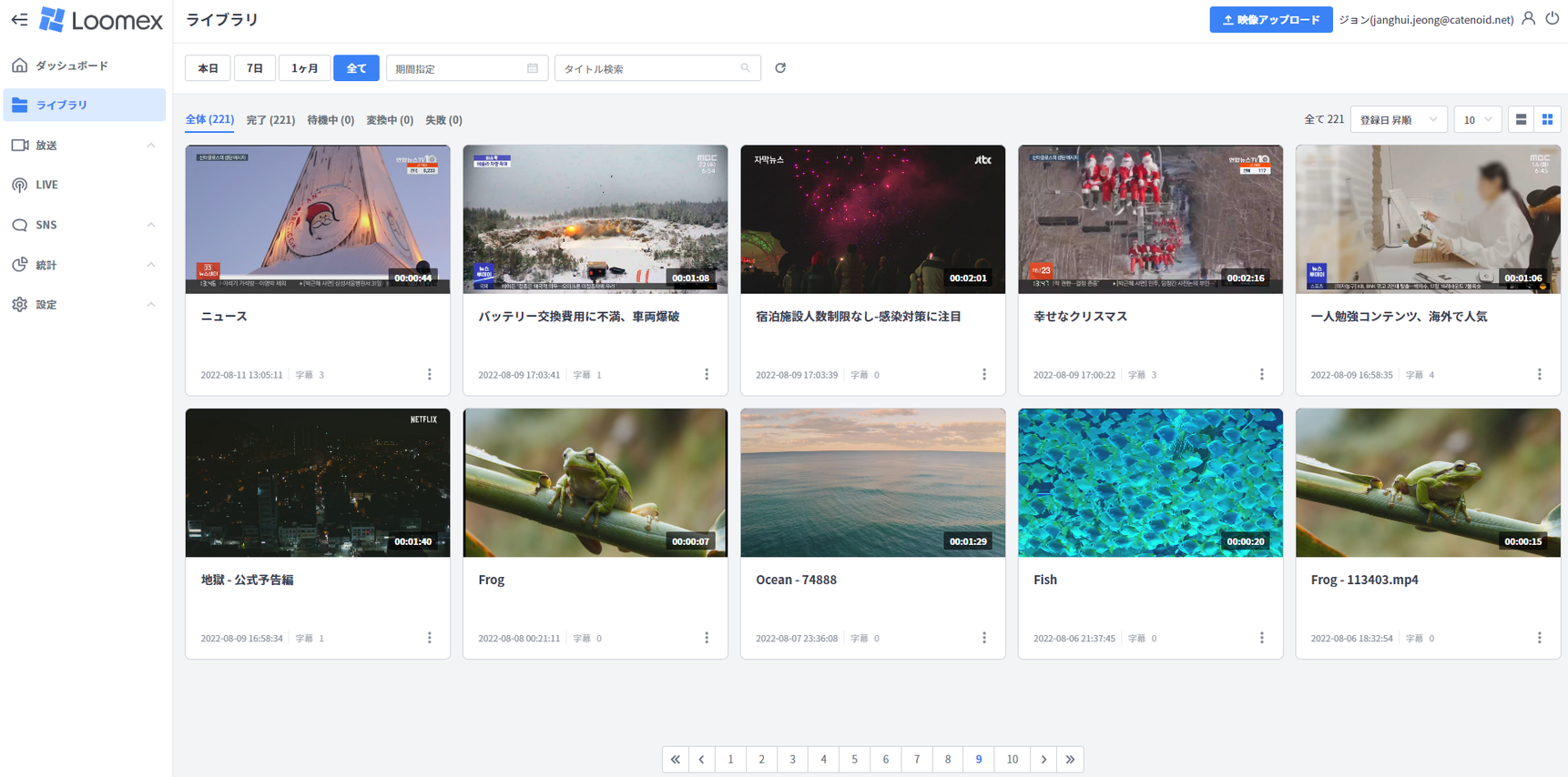 ライブラリ画面は映像アップロード及び検索機能を提供し、カテゴリ、映像長さ、字幕、登録状態、登録日基準の照会が可能です。