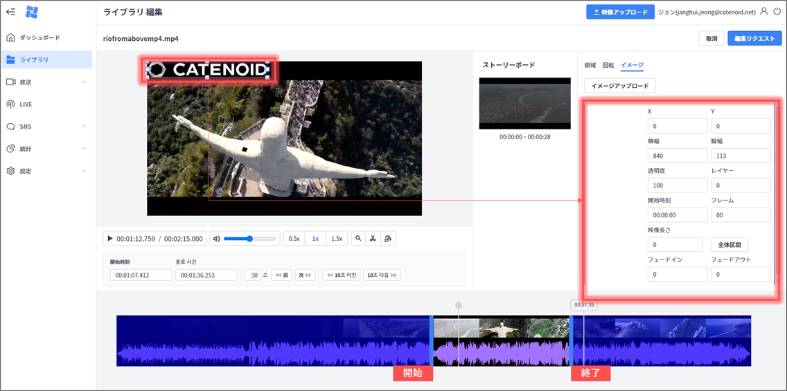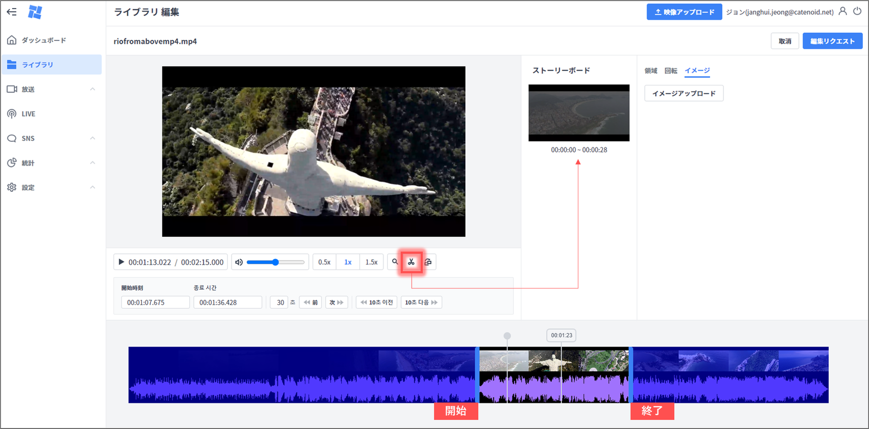 編集作業が終わってから編集リクエストボタンをクリックして編集映像を生成しなければ作業内容が反映されません。