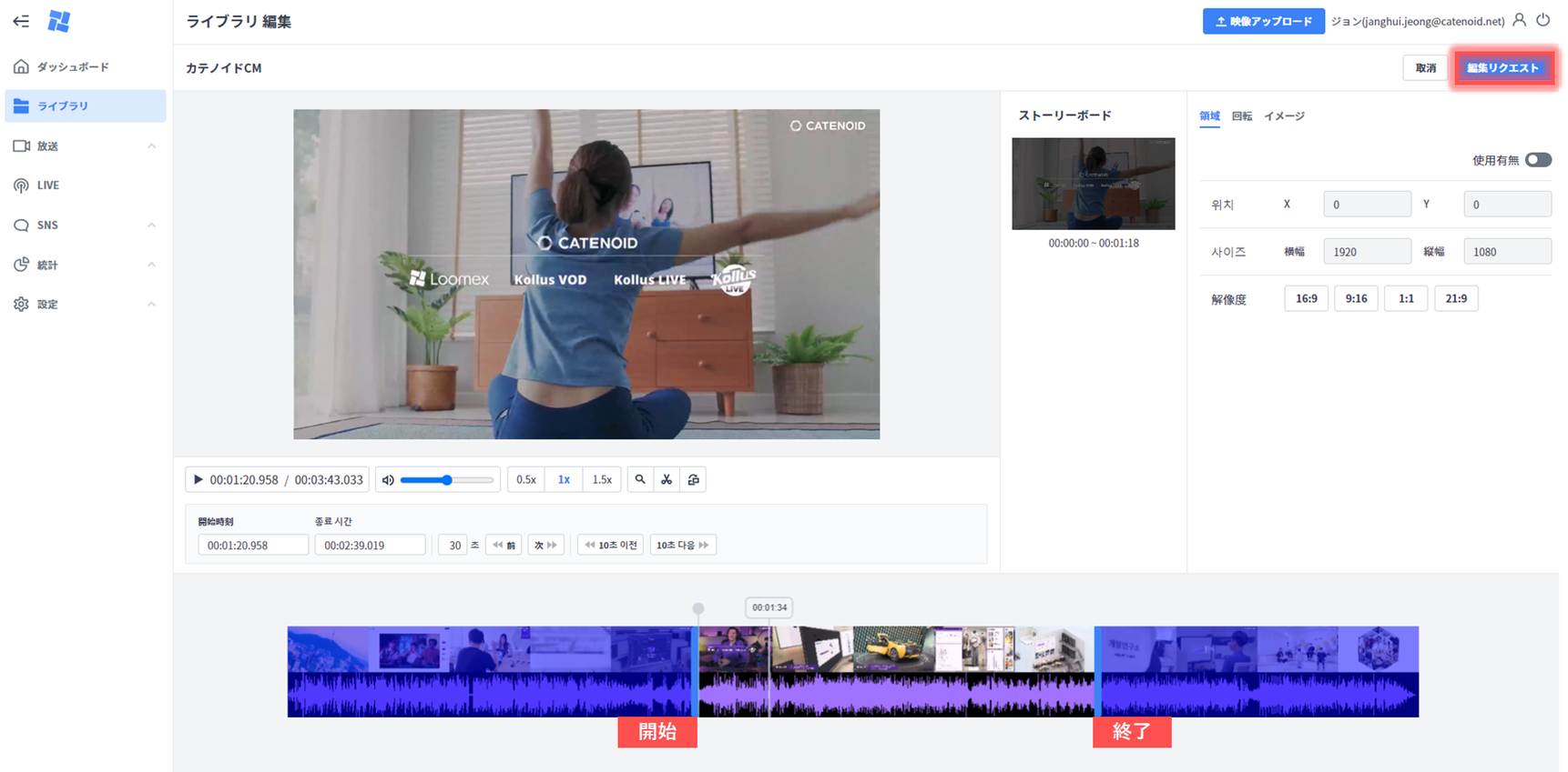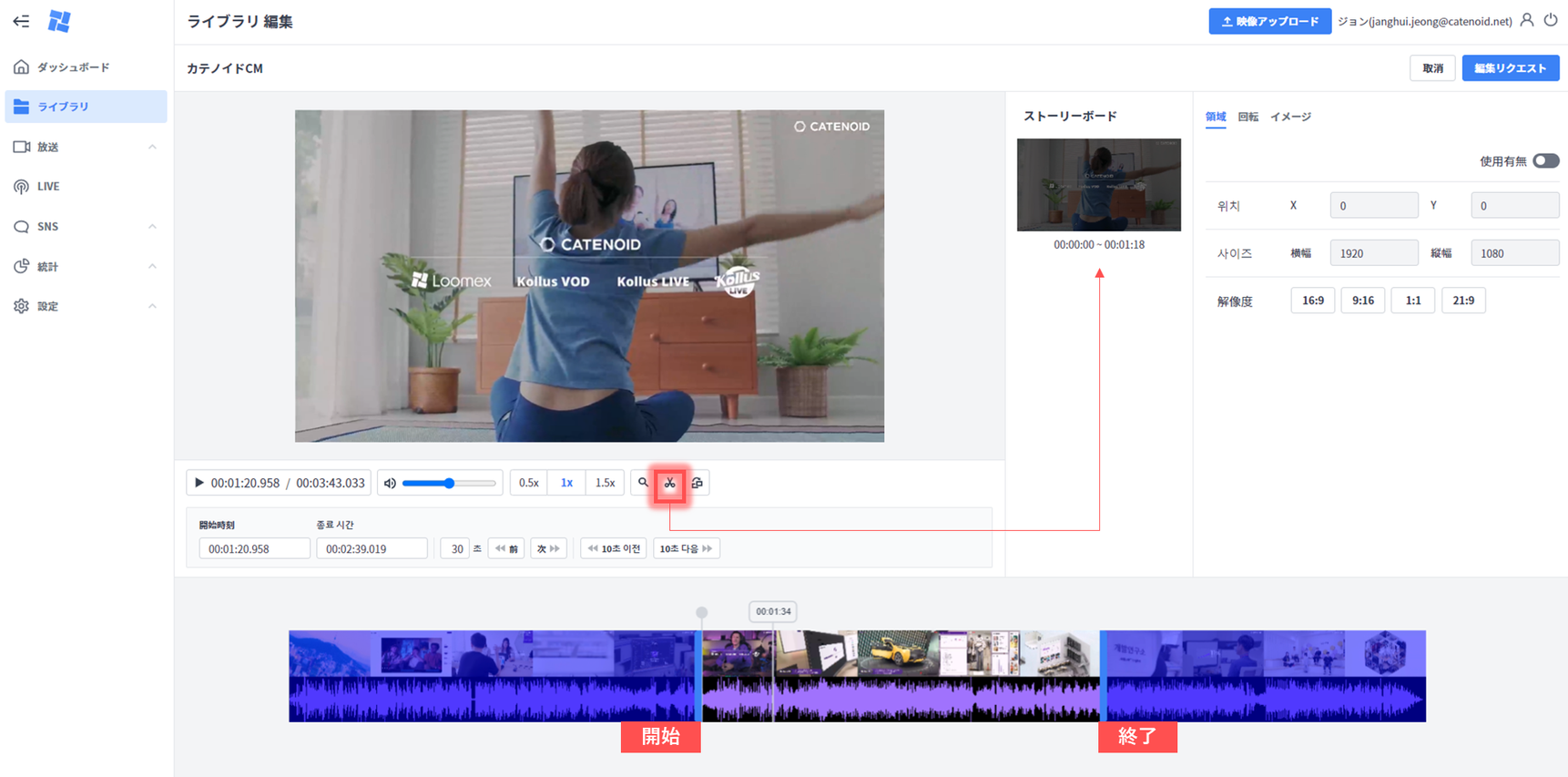 区間を指定してから\[切り出し]ボタンをクリックすると指定した区間がストーリーボードに追加されます。各映像の区間を切り出して編集リクエストボタンをクリックするとストーリーボードの全ての区間が一つの映像で結合されてライブラリに登録されます。