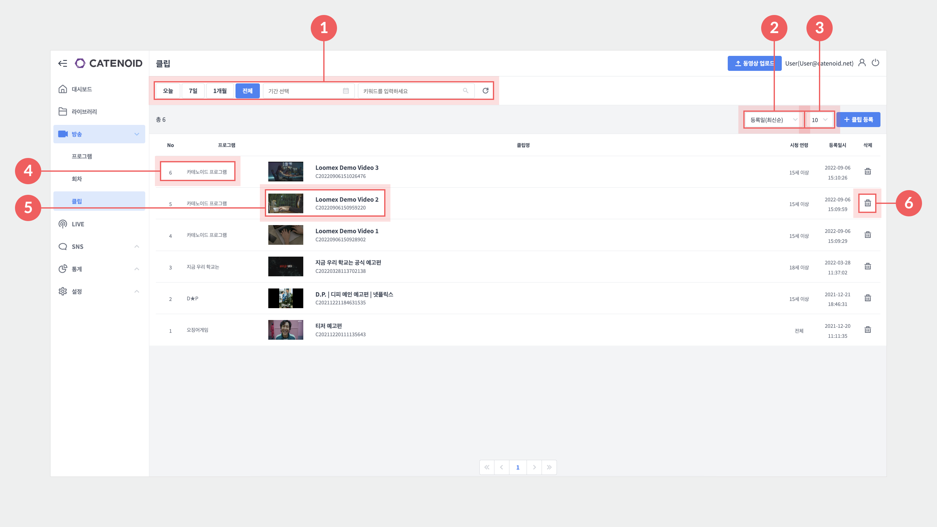 <table><thead><tr><th width="197">메뉴</th><th>설명</th></tr></thead><tbody><tr><td>검색</td><td><p>클립 목록 상단의 키워드 검색을 이용하여 원하는 클립을 검색할 수 있습니다.</p><p></p><p><strong>기간별 검색</strong>: 검색 버튼을 누르면 등록일을 기준으로 오늘, 일주일, 1개월에 해당하는 클립을 조회할 수 있으며 조회 기간을 선택하여 검색할 수 있습니다.</p><p></p><p><strong>키워드 검색</strong>: 클립명, 회차번호 등의 메타데이터의 키워드를 입력하여 회차를 검색할 수 있습니다. 하나 이상의 키워드를 입력할 수 있으며 조회 기간을 적용하여 검색할 수 있습니다.</p></td></tr><tr><td>정렬</td><td>클립 목록의 기본 정렬은 등록일(최신순)으로 정렬이 됩니다. 등록일 혹은 수정일을 최신순 및 오래된순으로 설정하여 목록의 정렬을 변경할 수도 있습니다.</td></tr><tr><td>페이지 노출 수 설정</td><td>한 페이지에 노출되는 동영상 콘텐츠의 개수를 지정할 수 있습니다. 기본 설정은 10개이며 옵션을 선택하여 변경할 수 있습니다.</td></tr><tr><td>프로그램 이동</td><td>클립과 연결된 프로그램 정보를 확인할 수 있으며 프로그램명을 클릭하면 프로그램 상세 화면으로 바로 이동합니다.</td></tr><tr><td>상세화면</td><td>클립명을 클릭하여 상세 화면으로 이동이 가능하며 상페 페이지에서 회차 정보를 편집하고 수정할 수 있습니다.</td></tr><tr><td>삭제</td><td>삭제 아이콘을 누르면 클립이 삭제됩니다.</td></tr></tbody></table>