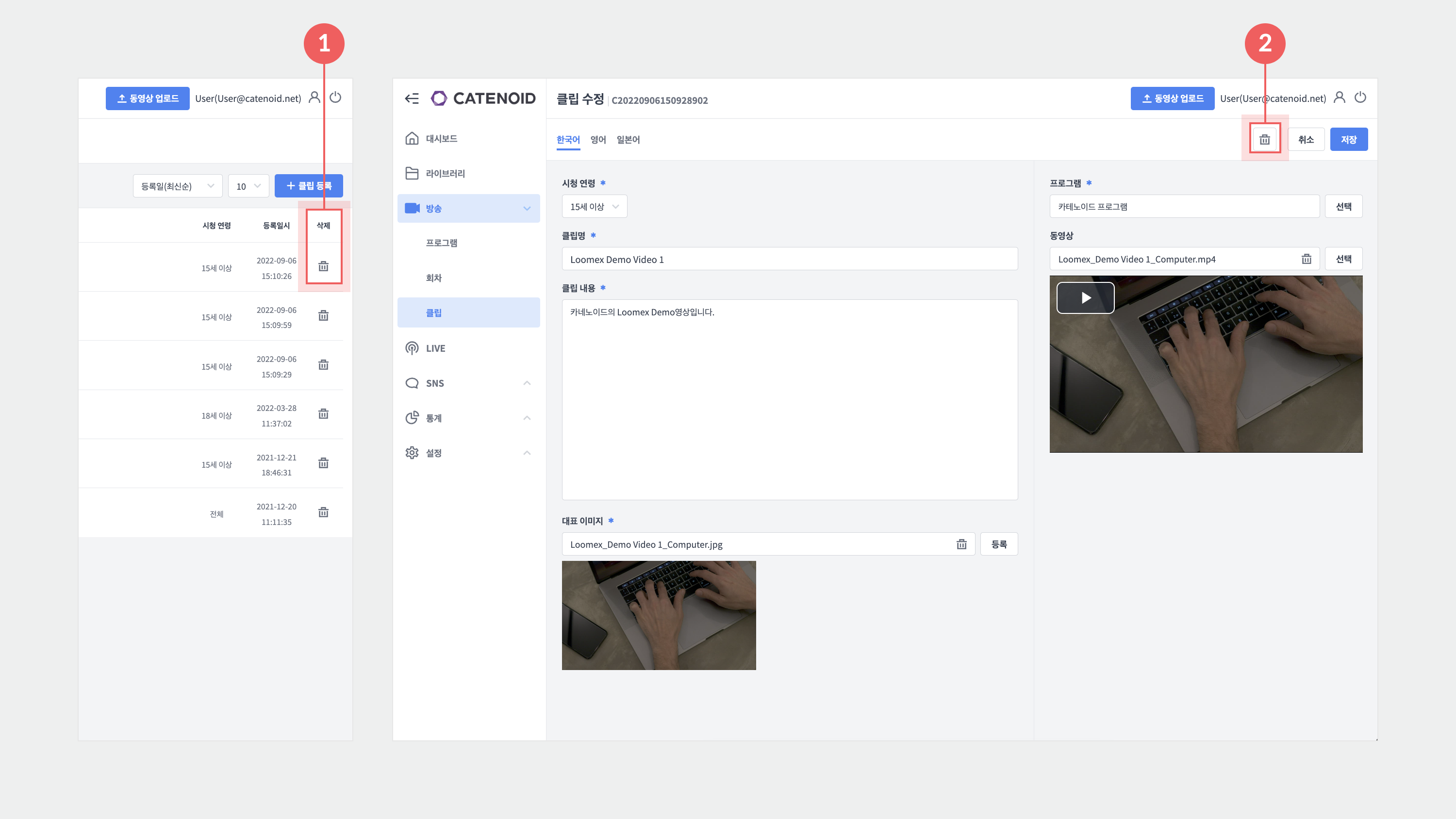 클립 목록이나 클립 수정 페이지의 삭제 아이콘을 눌러 클립을 삭제할 수 있습니다. 연결된 동영상이 존재할 경우에는 회차를 삭제 할 수 없습니다. 등록된 동영상을 먼저 삭제한 다음 클립 삭제를 진행합니다.